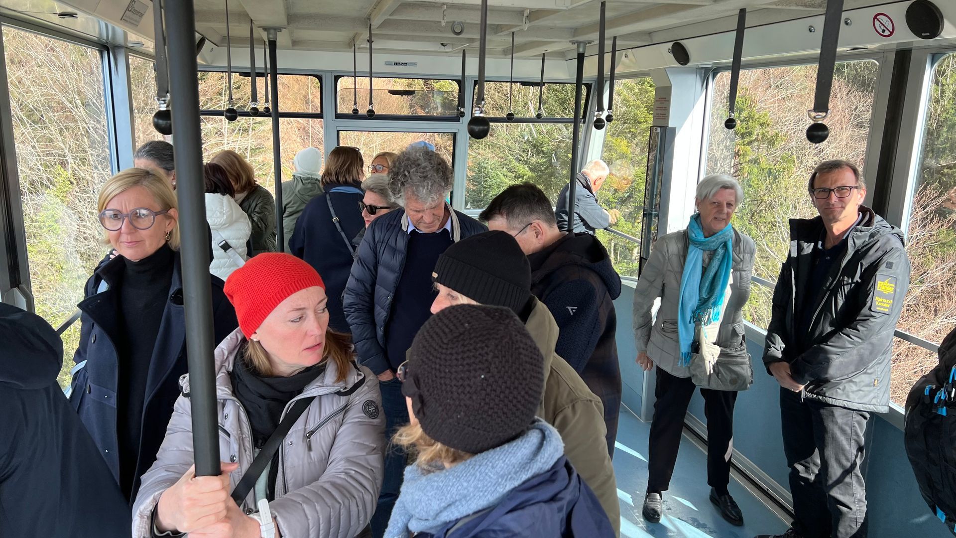 Im Museum in der Talstation wurden die Gewinner von ihm herzlich willkommen geheißen. Er informiert über die Entstehung und die Geschichte der Bahn. Bevor es mit der Großraumgondel nach oben ging, wurde die Seilbahnspannung und technische Einzelheiten des Pendelbahnsystems erläutert. Bei der Fahrt auf den Pfänder gab es einen herrlichen Ausblick über den Bodensee und die angrenzenden Regionen. Im neuen Seminarraum wurden die Gewinner bewirtet und erhielten weitere Informationen.