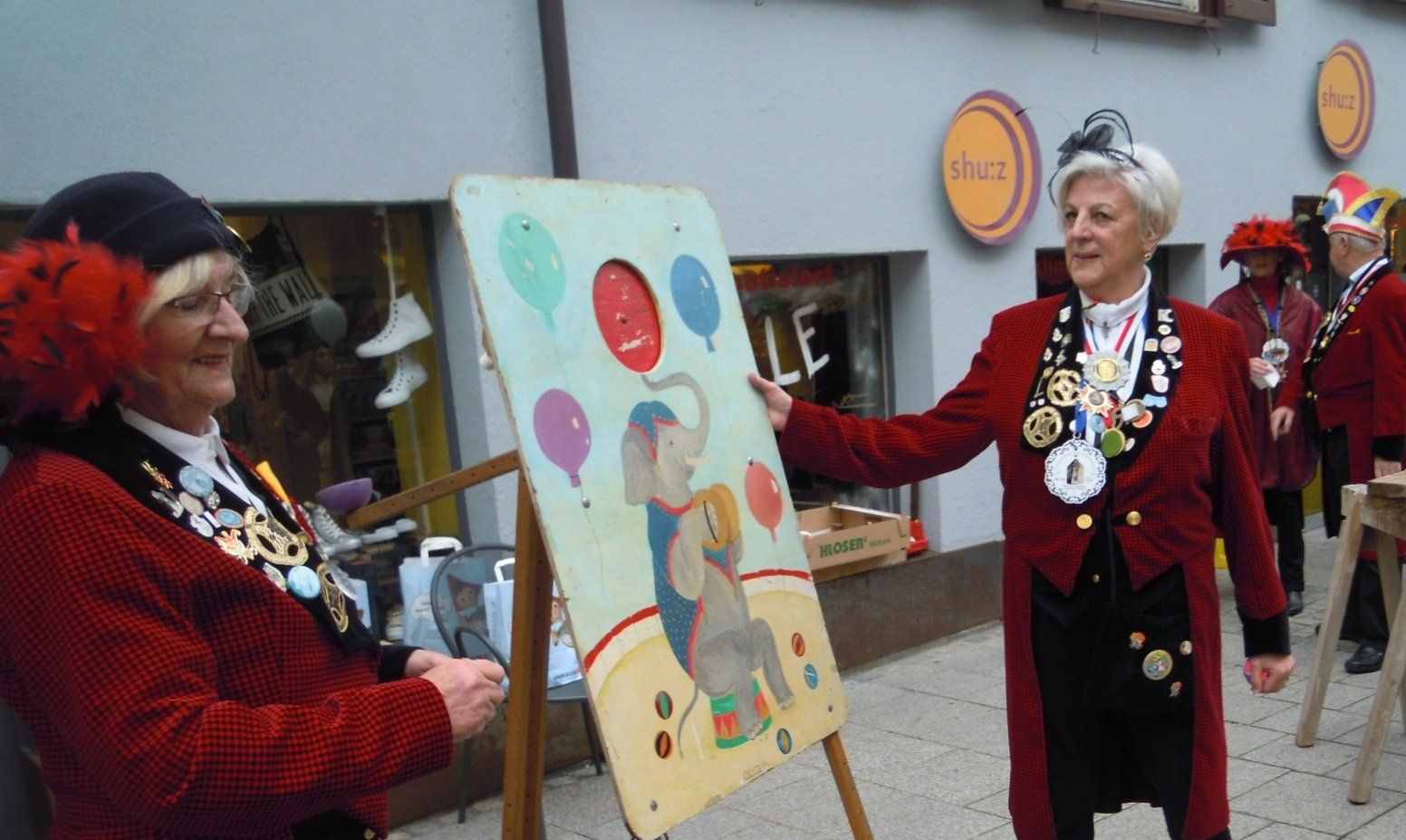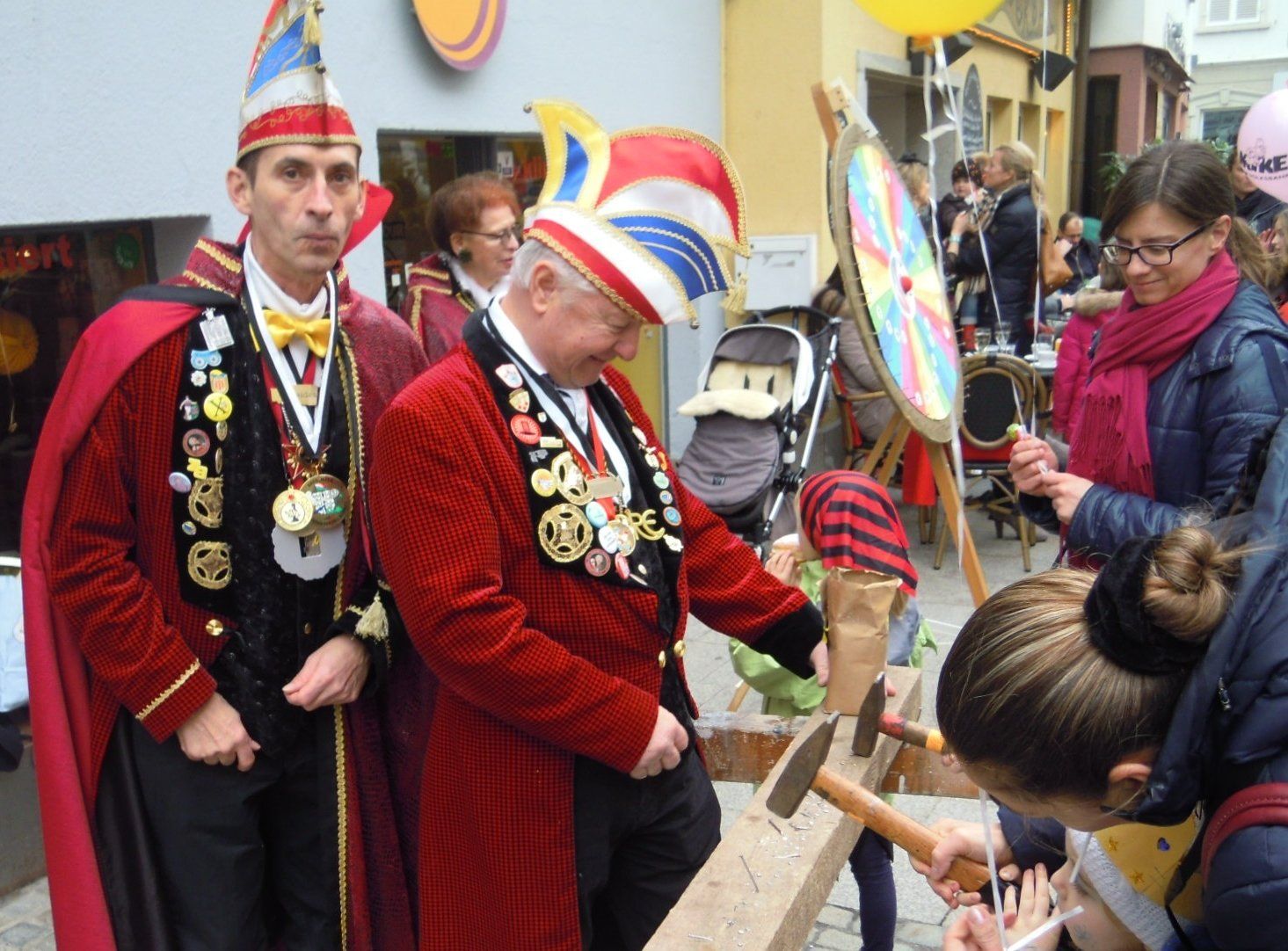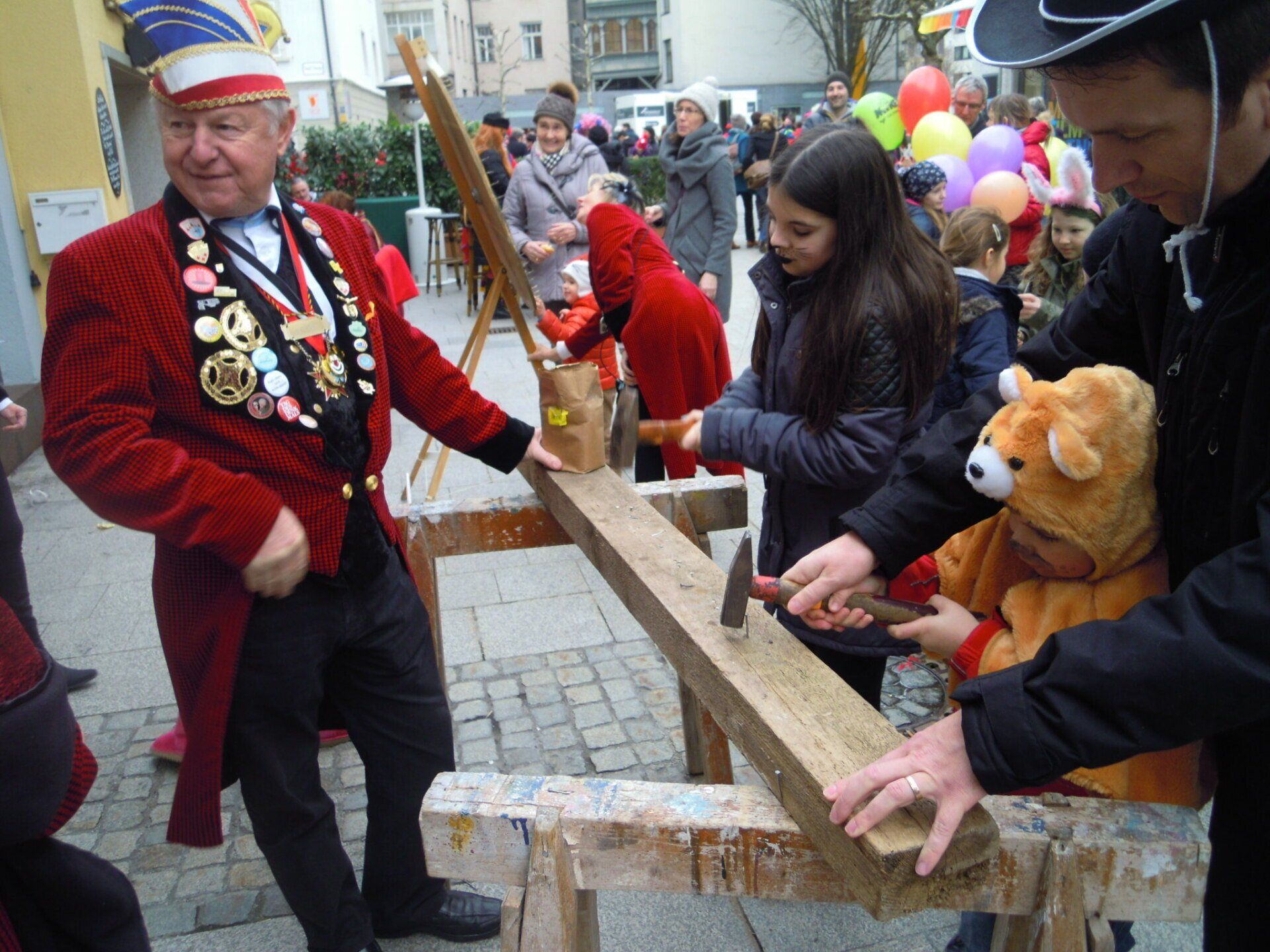 Die Bregenzer Faschingsgesellschaft (BFG) gilt als Veranstalter des schönen Gildenballs im Festspielhaus mehr als nobler, denn als närrischer Verein. Gut so! Aber: Wie in den vergangenen Jahren hat es sich die BFG als Mitglied des Verbandes Vorarlberger Fasnatzünfte und –gilden auch 2016 nicht nehmen lassen, am Faschingsdienstag nach der „Absetzung“ der Landesregierung den traditionellen Ore Ore Kinderfasching in der Bregenzer City tatkräftig zu unterstützen. Kleine Mäschgerle hatten wieder die Chance, bei unseren Spiel-Stationen Krapfen, andere Süßigkeiten oder ein Spielzeug zu gewinnen. Der Andrang beim Wurfspiel, Glücksrad oder Nagelbalken war zeitweise groß. Mädchen oder Buben ohne Maske bzw. Kostüm wurden vorher zum nahen Schmink-Corner der (Alt)Prinzessinnen geschickt, bevor sie ihr Glück versuchen oder ihre Geschicklichkeit bim Einhämmern von Nägeln beweisen konnten.
