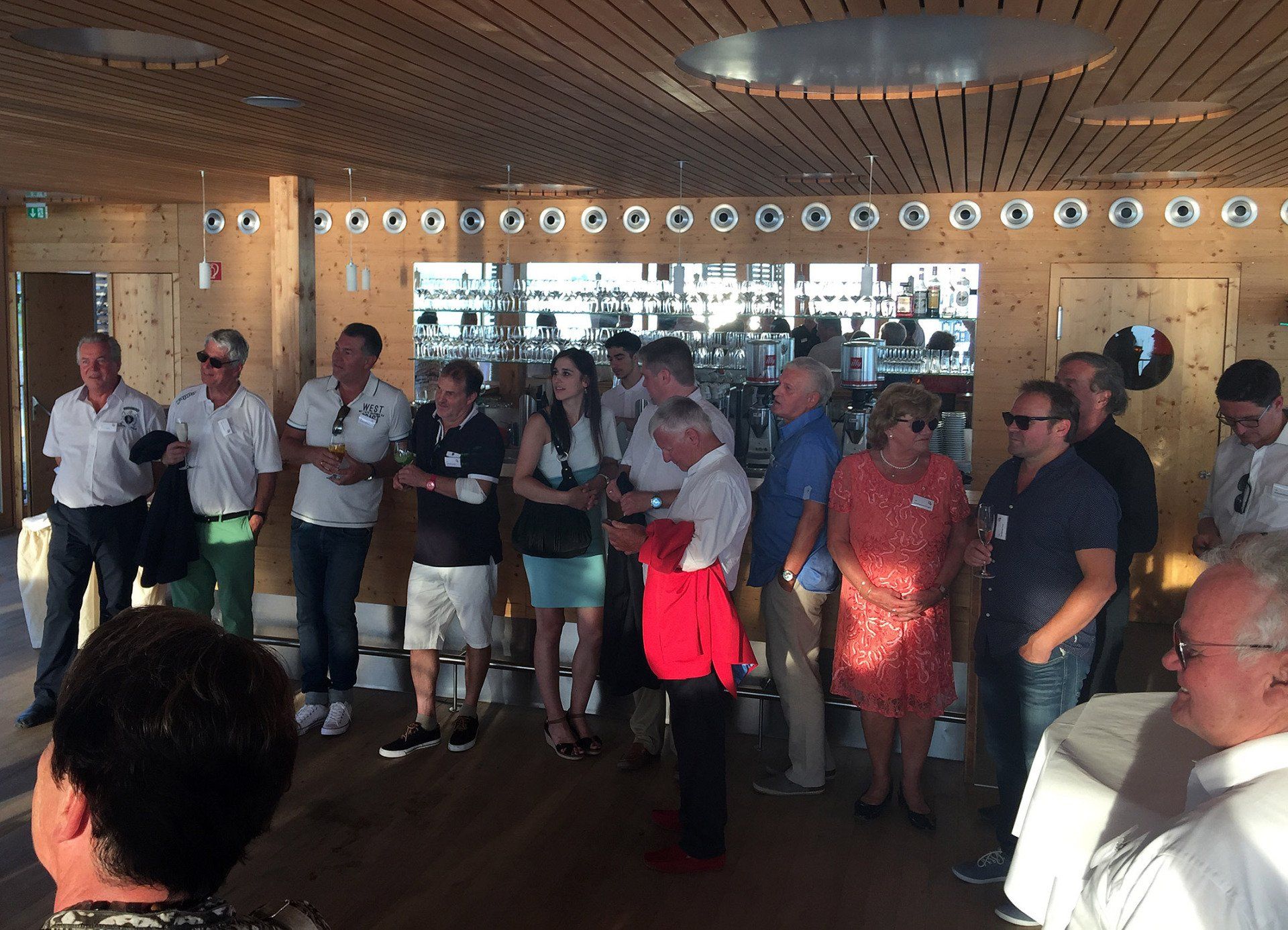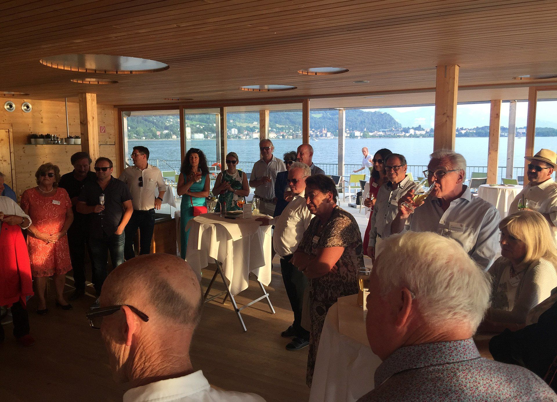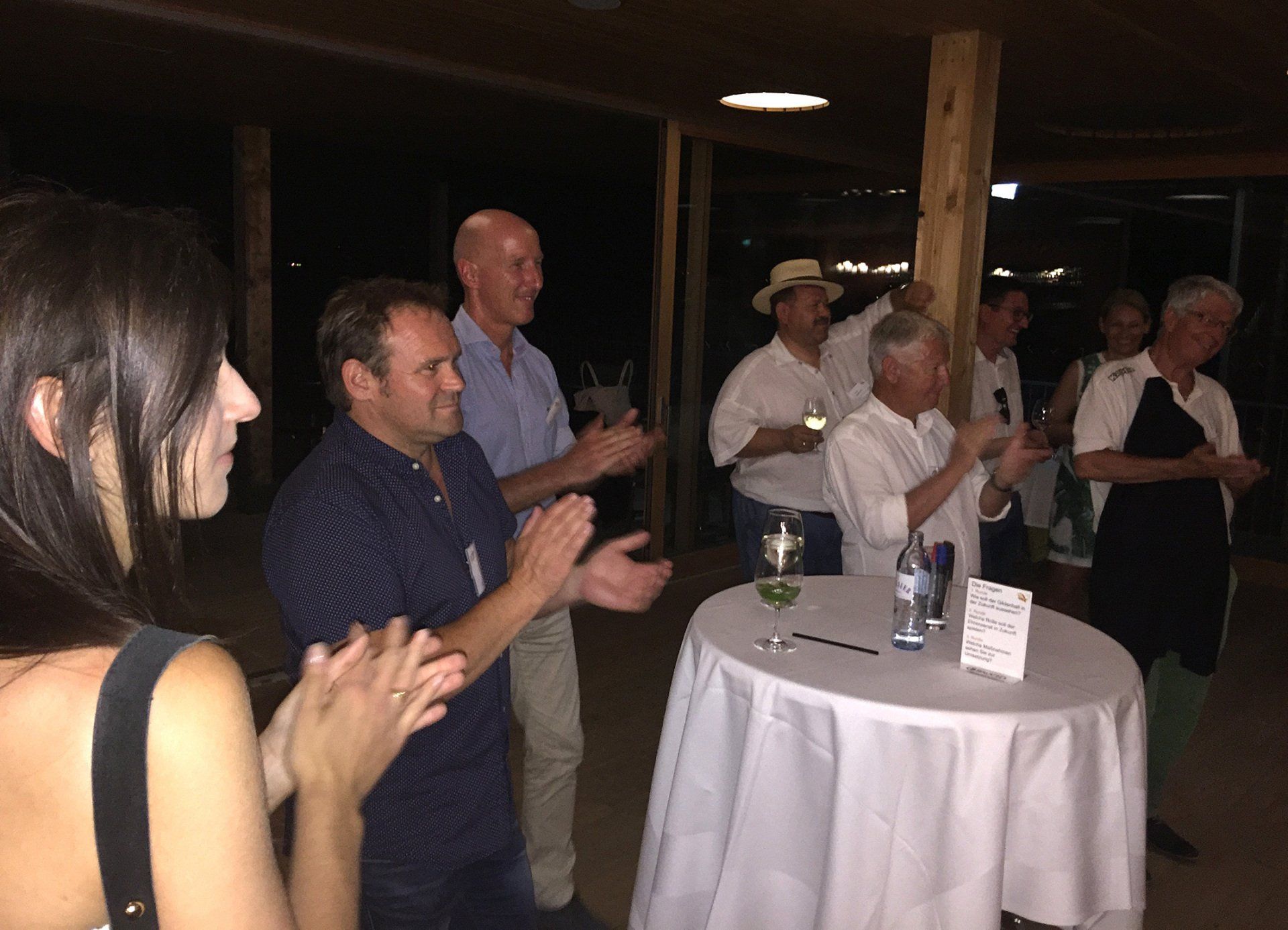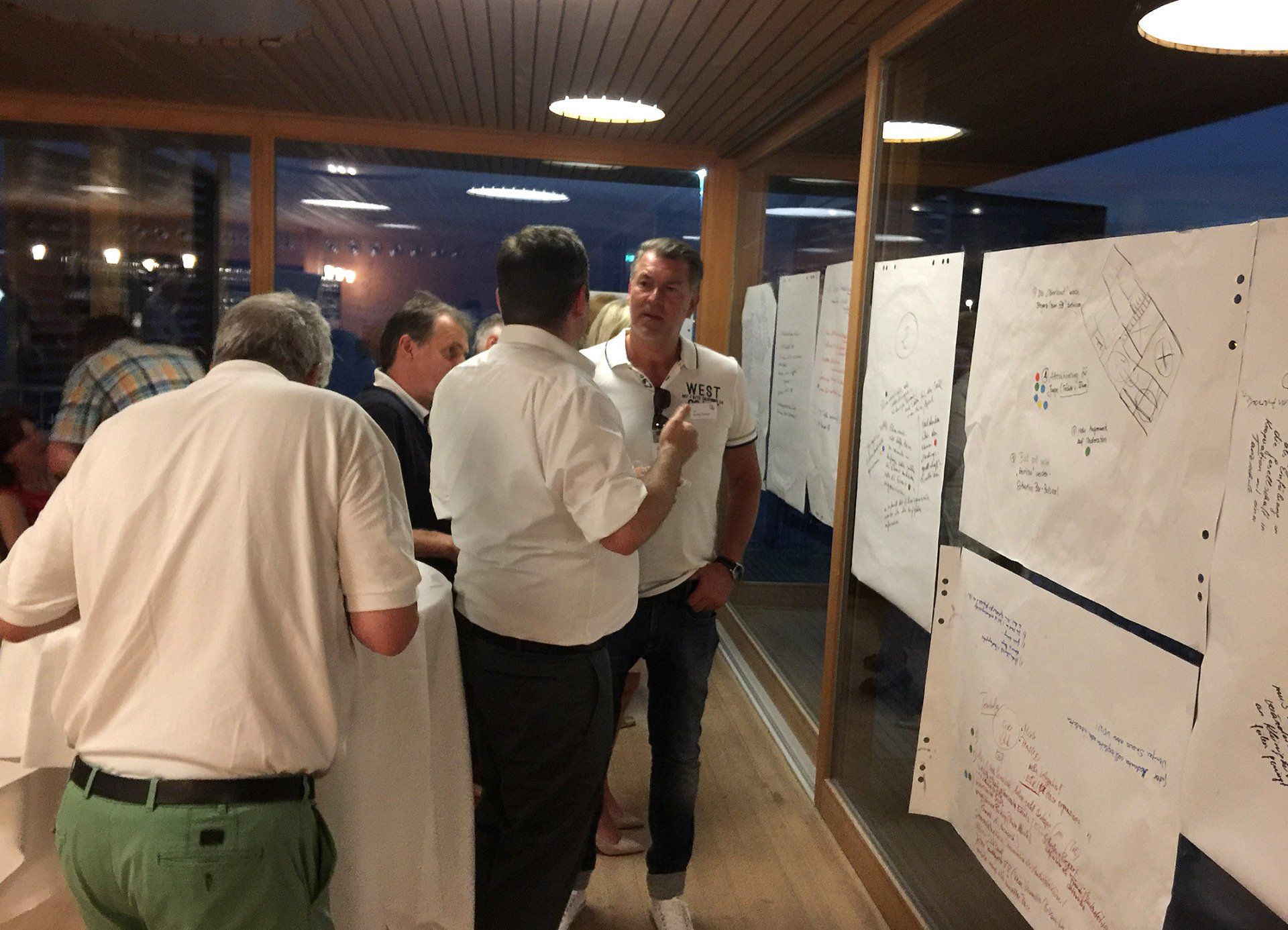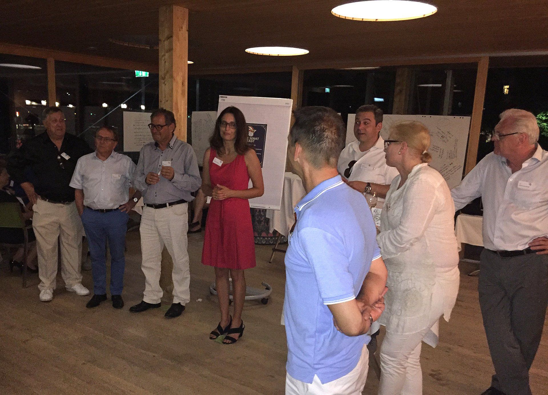 Was wir uns an Umgebung vorstellten, fanden wir im Badehaus am Kaiserstrand. Das Badehaus steht im Wasser und der Blick über den See lässt Grenzen verschwinden. Fingerfood und Getränke stärkten uns und die Terrasse lud zu geselligen Gesprächen ein. Die Antworten und Schlagworte zu den drei Tagungsfragen: "1. Der Gildenball in der Zukunft", "2. die Rolle des ESR in der Zukunft" und "wie verbinden wir 1 + 2?" wurden auf Flipcharts an den Wänden veröffentlicht und mit Klebepunkten von den Teilnehmern bewertet.