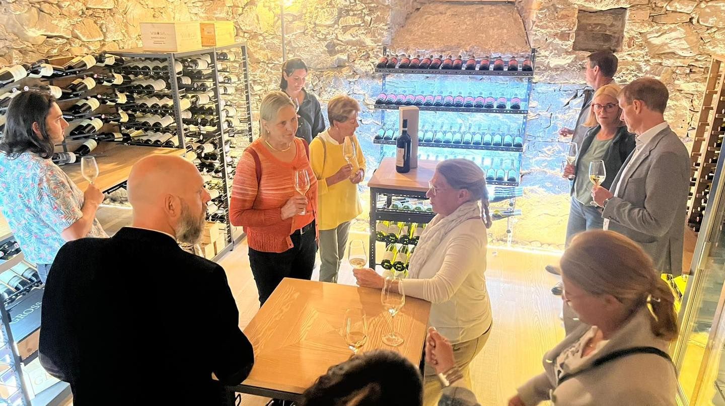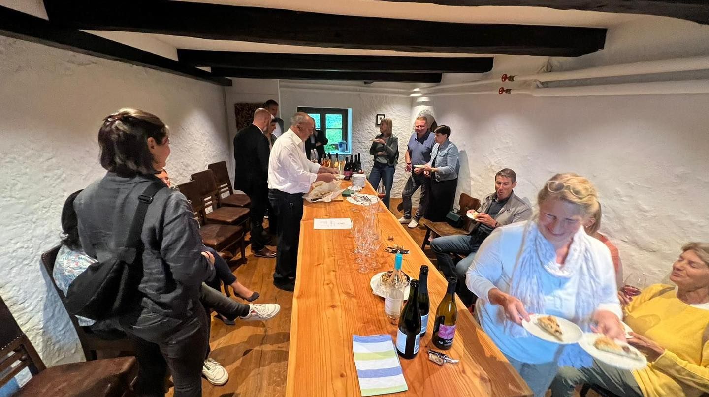 Nach der Begrüßung führte Frau Dr. Scheyer durch die schönen Räume und erzählte einige interessante Gegebenheiten und informierte über die Geschichte, die in diesem ehrenwürdigen Haus stattgefunden haben. Der Ausblick in Richtung Feldkirch und in die Schweiz hat die Besucher begeistert. Gemeinsam mit Eventplanerin Stefanie Lässer und Privatkoch Daniel Kohler bringt Familie Scheyer seit 2023 mit neuen Eventformaten frischen Wind in die alten Gemäuer. So kann Schloss Amberg als Eventlocation mit seinen wunderschönen Räumlichkeiten und dem tollen Außenbereich für Hochzeiten, Geburtstagsfeiern oder Vorträge gebucht werden. Nach dem Rundgang erwartete die Gewinner wir noch ein weiteres Highlight - den Weinkeller des Schlosses und Liebling des Schlossherren. Dort fand das exklusive Event für die Gildenball Gewinner bei der Verkostung des eigenen Weines mit selbstgemachtem Fingerfood ihren Ausklang.