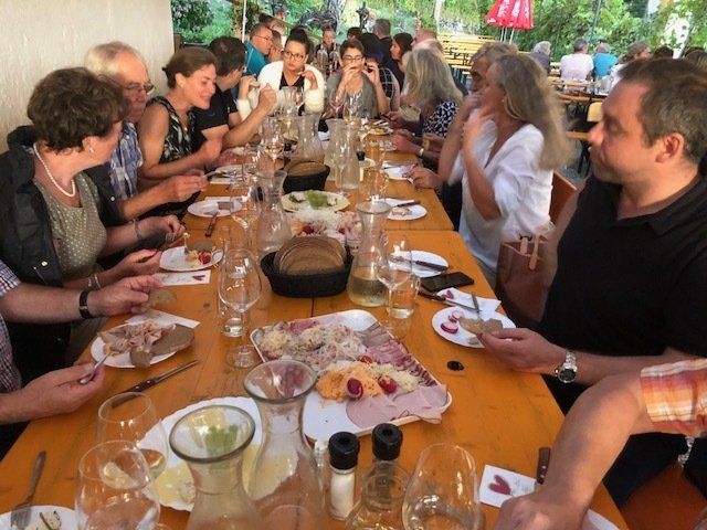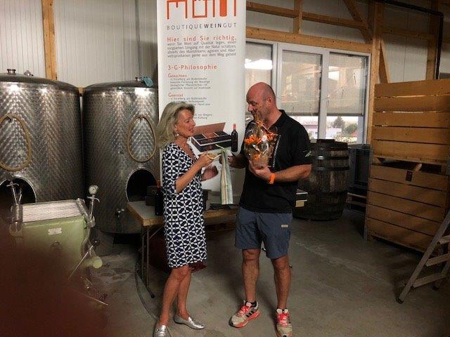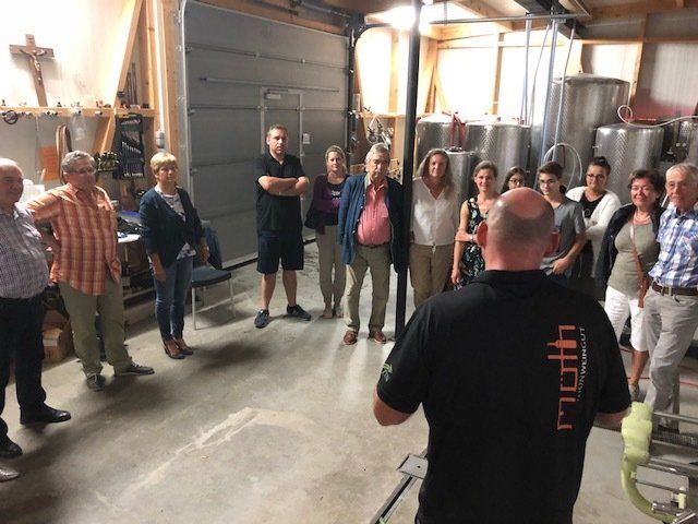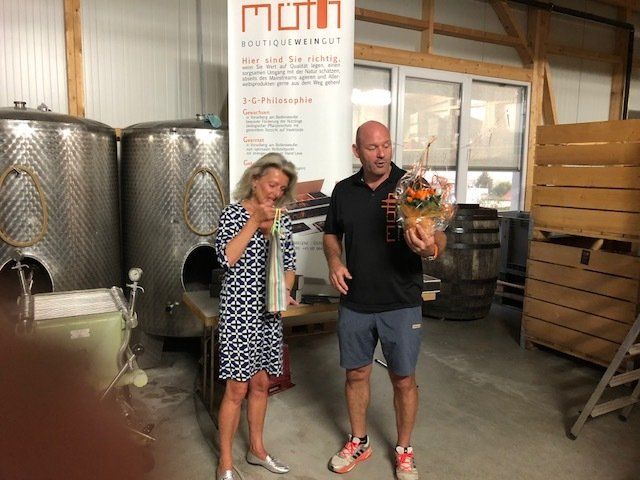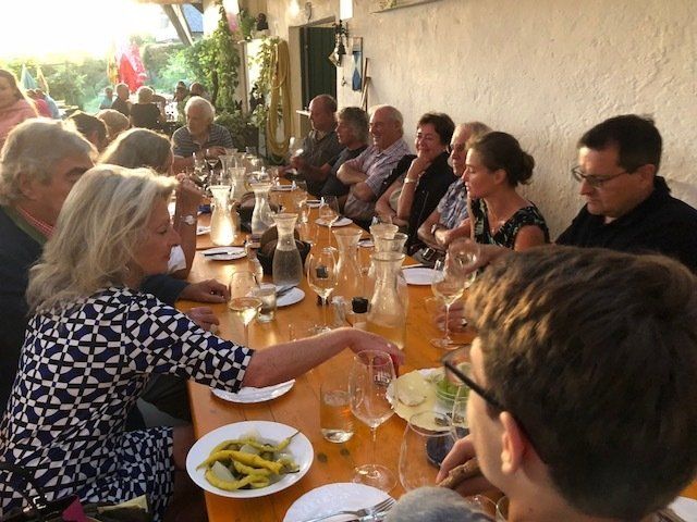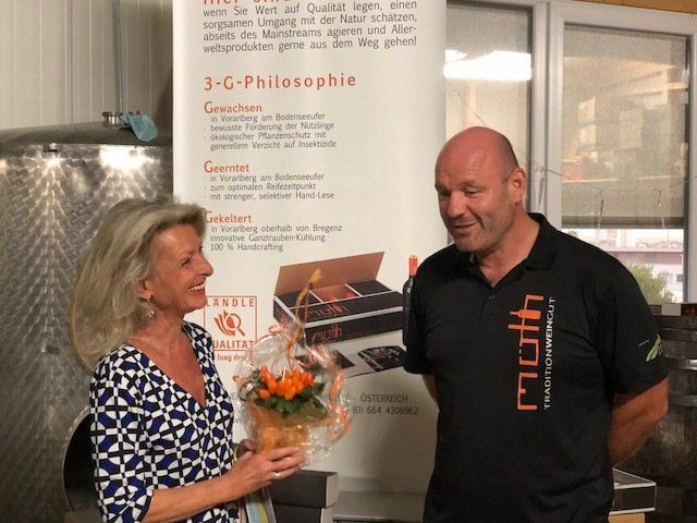 Auch dieses Jahr konnten Gewinner des Tombolapreises beim Gildenball 2018 einen genussvollen Abend - umrahmt von Weingärten - bei der Winzerfamilie Michaela und Sepp Möth , unterhalb des Gebhardsberg, verbringen.Die Gäste erhielten in der Kellerhalle von Sepp Möth in seinen Erklärungen detaillierte Einblicke in den Winzeralltag. Bezüglich der Ernte 2018 gibt sich der Winzer, infolge der guten klimatischen Verhältnisse mit einem schädlingsfreien Jahr, sehr optimistisch und spricht somit von einem Jahrhundert-Jahrgang 2018.Besonders stolz ist man auf die kurz vor Saisonbeginn errichtete neue Überdachung des Heurigen. Durch einen Sturm, wenige Tage vor Eröffnung im April, wurde die alte Sonnensegel-Überdachung aus der Verankerung gerissen. Statt einer Reparatur entschied sich die Familie vorausschauend für ein Dach mit gutem Lichteinfall und hellen Holzlatten. Nachdem sich die Elferrätin der Bregenzer Faschingsgesellschaft (BFG) Sonja Scholl mit einem Präsent bei Sepp Möth für dieses Event bedankte, mit der Bitte dasselbe auch 2019 zu ermöglichen, wurden die Geladenen anschließend mit den Gaumenfreuden des Hauses verwöhnt.Das es den fröhlich und gut gelaunten Gästen sehr gefallen hat, erwies sich durch das gesellige Miteinander bis kurz nach der Sperrstunde.