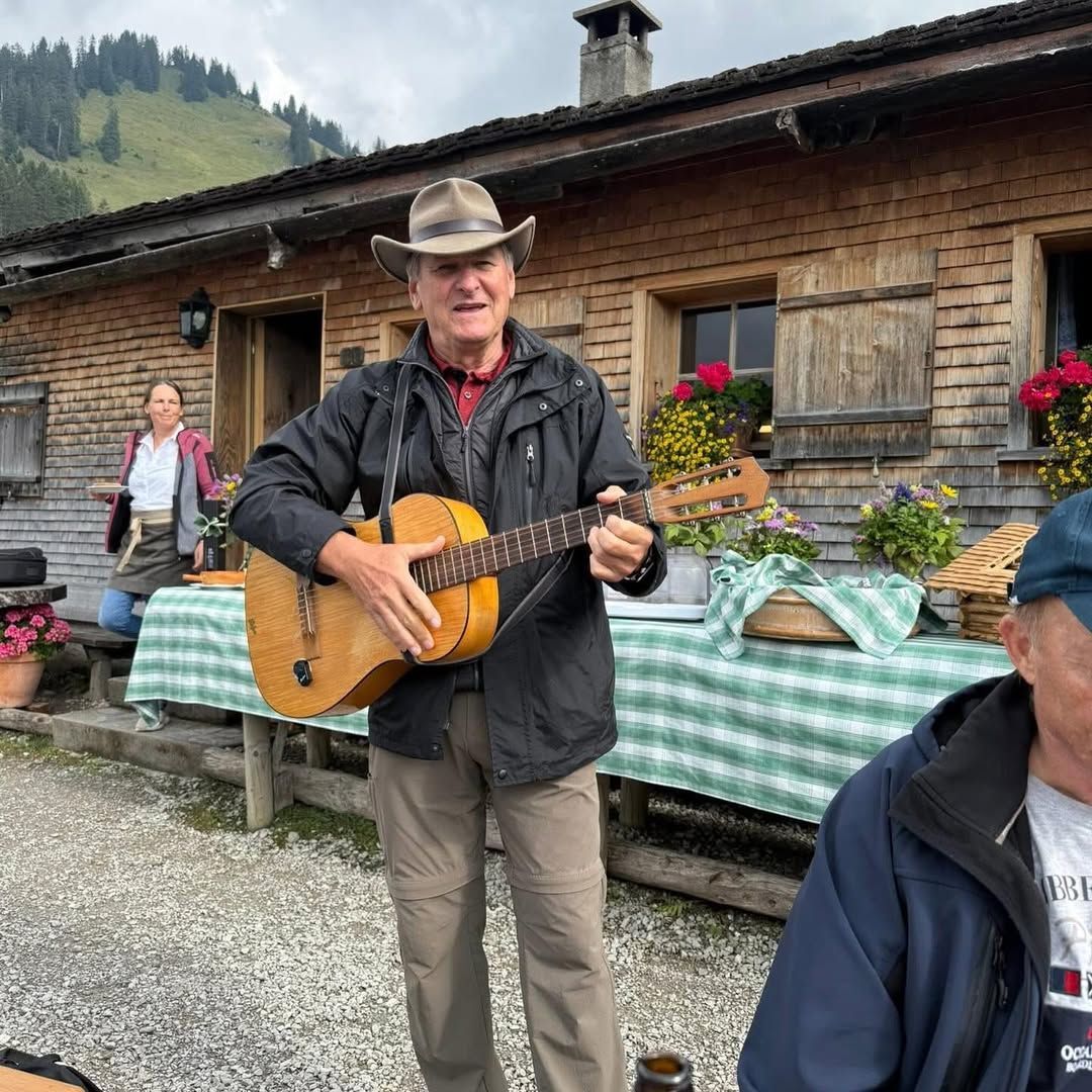 Alfred Frühwirth, Elferrat und Musikus der Bregenzer Faschingsgesellschaft, der auf seiner Gitarre bekannte Lieder spielte – und rasch stimmten alle Wanderfreunde begeistert mit ein.