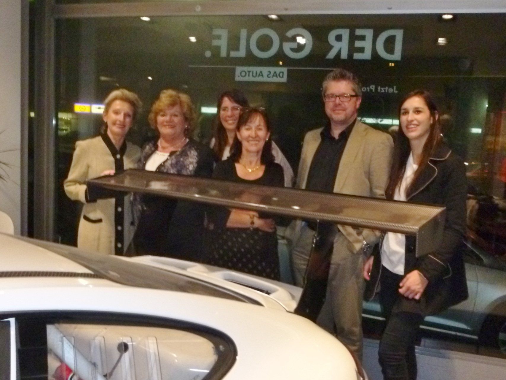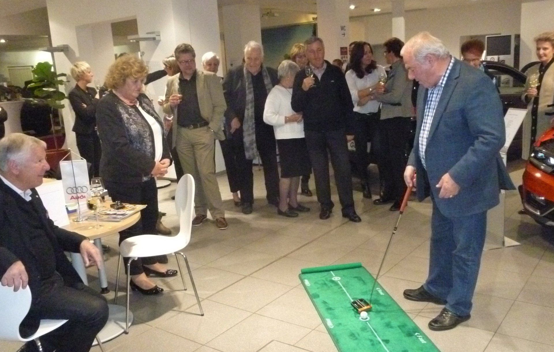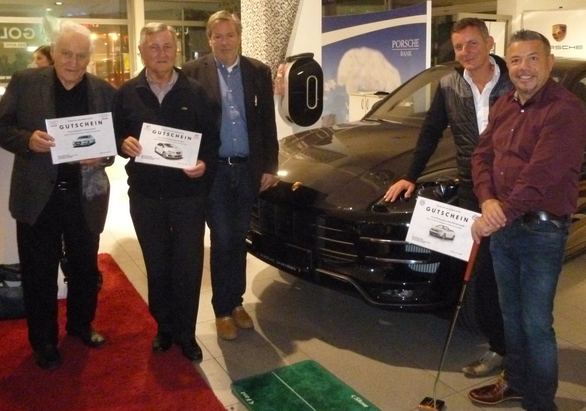 Kürzlich hatten Tombolagewinner des Gildenballes 2015 bei Porsche Dornbirn die Chance, ein VW Golf Cabrio zu gewinnen - allerdings nur für ein Wochenende. Porsche-Dornbirn Geschäftsführer Jörg Peham und Verkaufsleiter Horst Giselbrecht begrüßten die Gewinner und BFG-Begleiter. Mit einem Quiz wurden jene drei Teilnehmer ermittelt, welche die Fragen am treffendsten beantwortet hatten. Wegen Punktegleichheit in jedem der drei Ränge mussten die endgültigen Gewinner in einem Golfturnier beim Indoor-Putten ausgepielt werden. Das gelang am besten Salvatore Antonaci (VW-Cabrio), Heinz Hämmerle (Audi) und Hermann Schönberger (Seat), die sich auf ein schönes Wochenende mit 400 Frei-Kilometern freuen können.