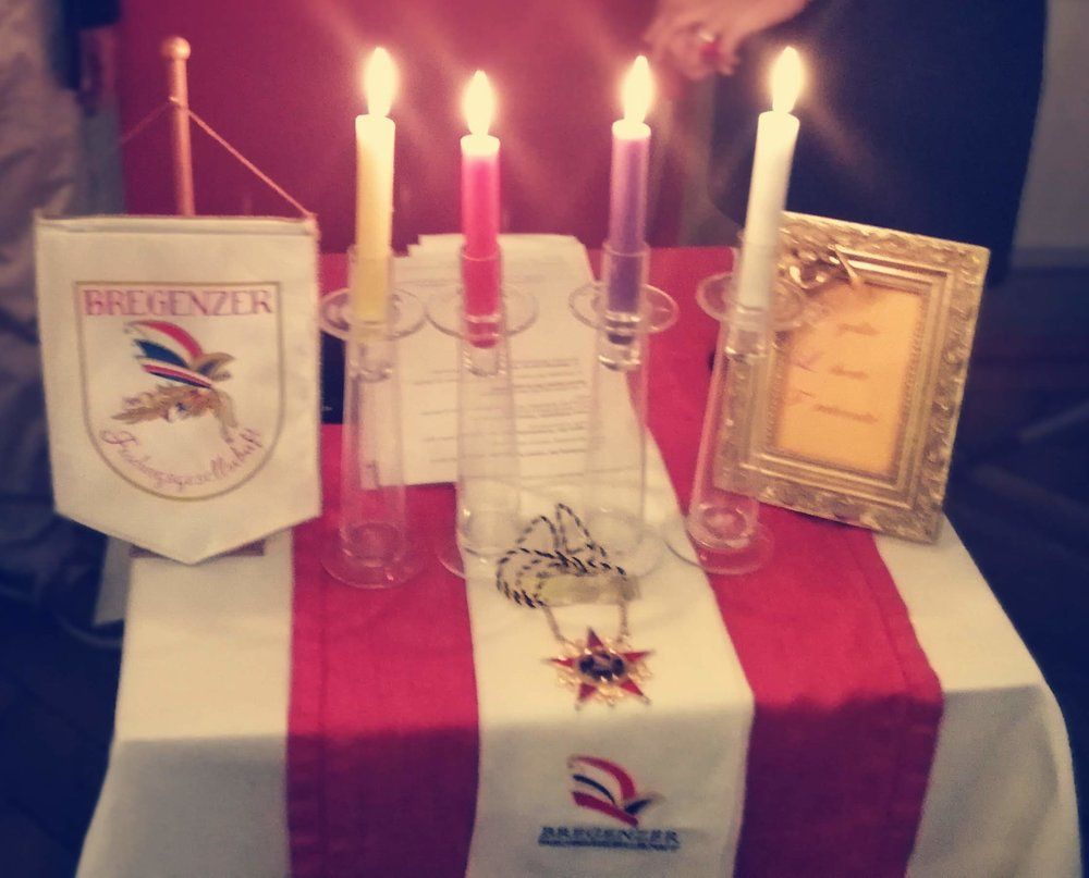 Mit feierlich entzündeten Kerzen in den Farben weiß, blau rot (Trikolore) sowie gold (bürgerliche Revolution) versinnbildlichte der Präsident die ELF und die Farben unseres Narrenhutes.